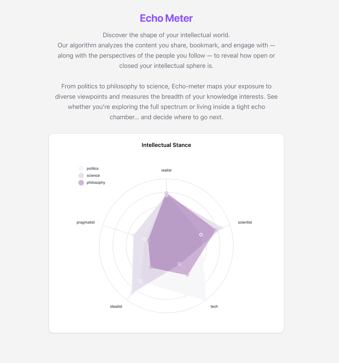 From politics to philosophy to science, Echo-meter maps your exposure to diverse viewpoints and measures the breadth of your knowledge interests. See whether you're exploring the full spectrum or living inside a tight echo chamber… and decide where to go next.